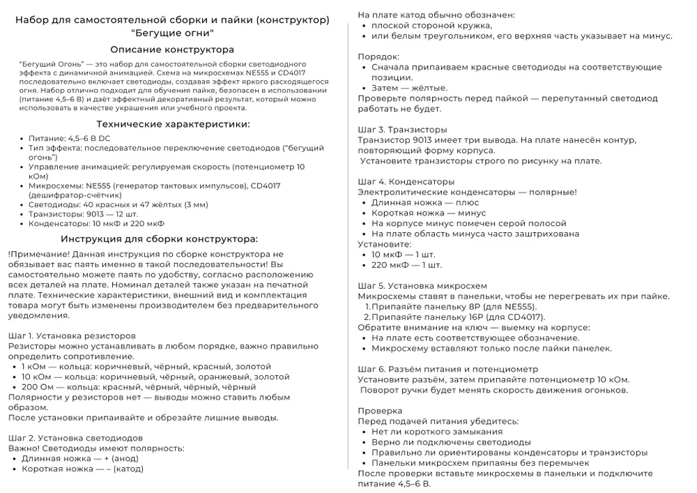 “Бегущий Огонь” — это увлекательный набор для самостоятельной сборки светодиодного эффекта с динамичной анимацией. Конструктор позволяет почувствовать себя настоящим инженером: вы самостоятельно спаиваете элементы, подключаете питание и наблюдаете, как готовая схема оживает яркими огнями.