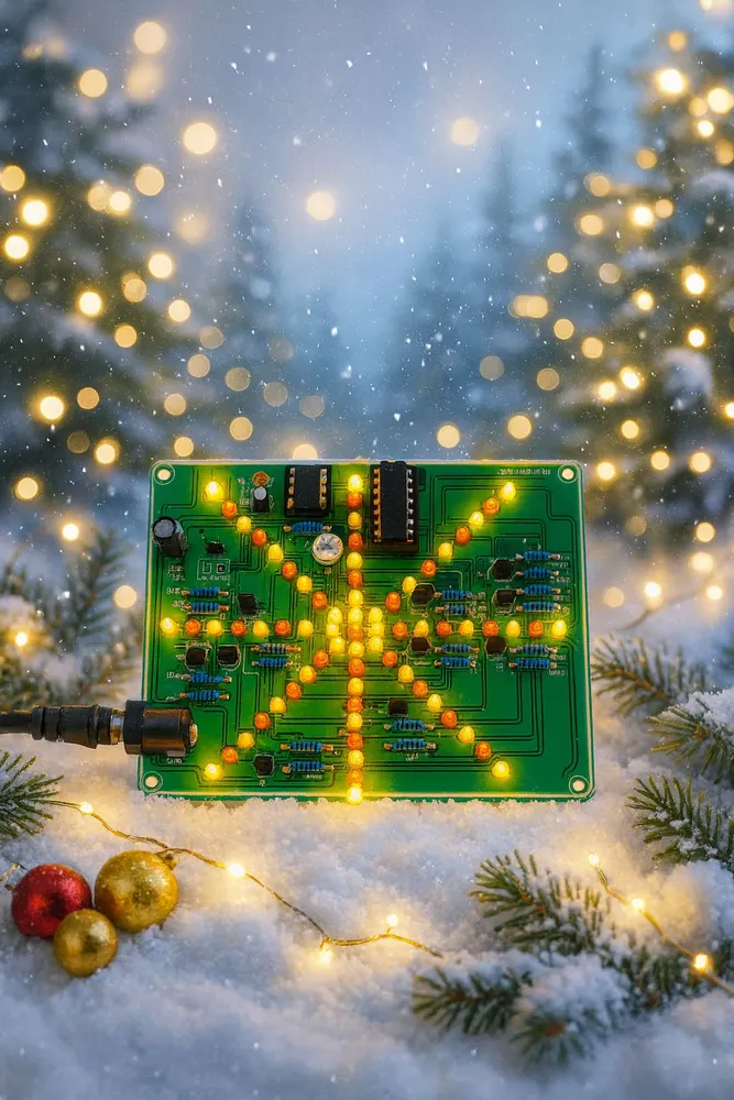 В основе устройства — классическая схема на микросхемах NE555 и CD4017, создающая эффект плавно движущегося света. Светодиоды последовательно загораются и создают впечатление расходящихся лучей — эффект “взрывного бегущего огня”. Скорость переключения удобно регулируется подстроечным резистором.