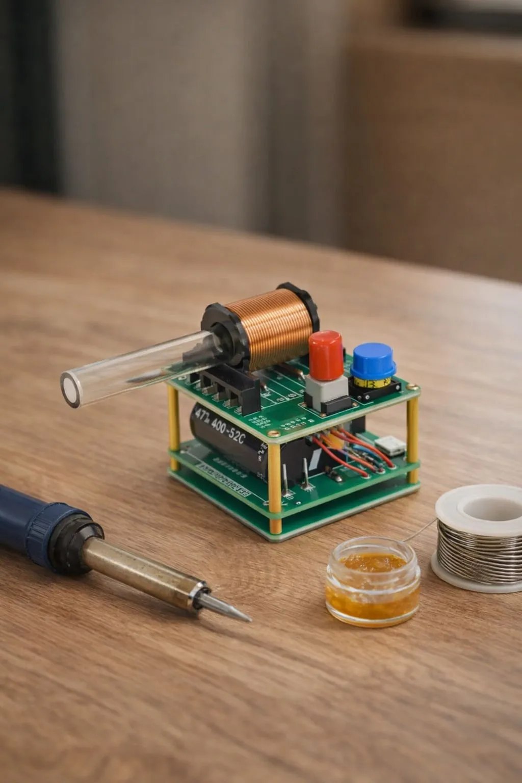 Питание 5 В → повышение напряжения → заряд конденсатора → импульсный разряд → магнитное ускорение сердечника → повторный заряд.