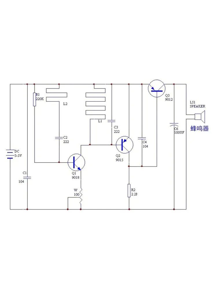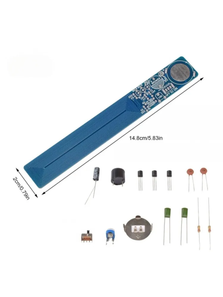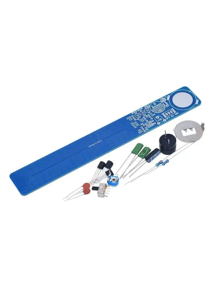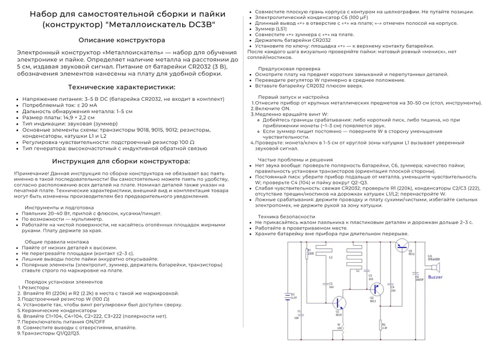 Сборка осуществляется по классической схеме металлоискателя: генератор звуковой частоты с индуктивной обратной связью и транзисторный звуковой усилитель. На плате предусмотрены все обозначения элементов (шелкография), что делает монтаж простым и понятным даже для новичков. Прибор определяет наличие металлических предметов на расстоянии 1–5 см, подавая звуковой сигнал через зуммер.