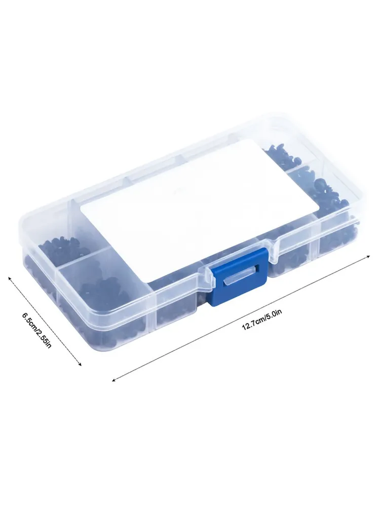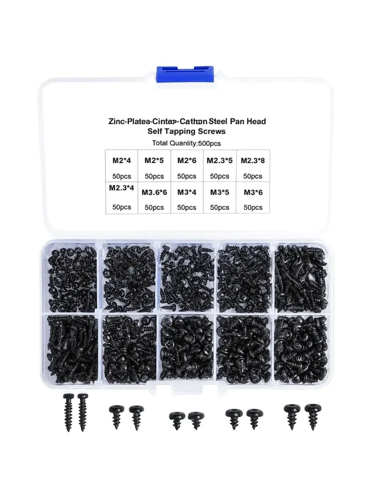 Профессиональный набор черных саморезов — идеальный выбор для дома, мастерской и сервисных центров. В комплект входит 500 саморезов популярных размеров (M2, M2.3, M2.6, M3), каждый из которых уложен в свою ячейку для удобства использования.
